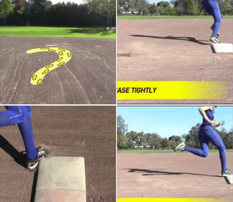 Imagine the question mark when approaching 1st. It’s important to note that it doesn’t matter which foot you use to tag the INSIDE of first base. What matters is you stay in stride. You can use your inside or outside foot – as long as you don’t stutter your steps when rounding. Every step/second matters and how you round this base could be the difference of being SAFE or OUT at 2nd base.